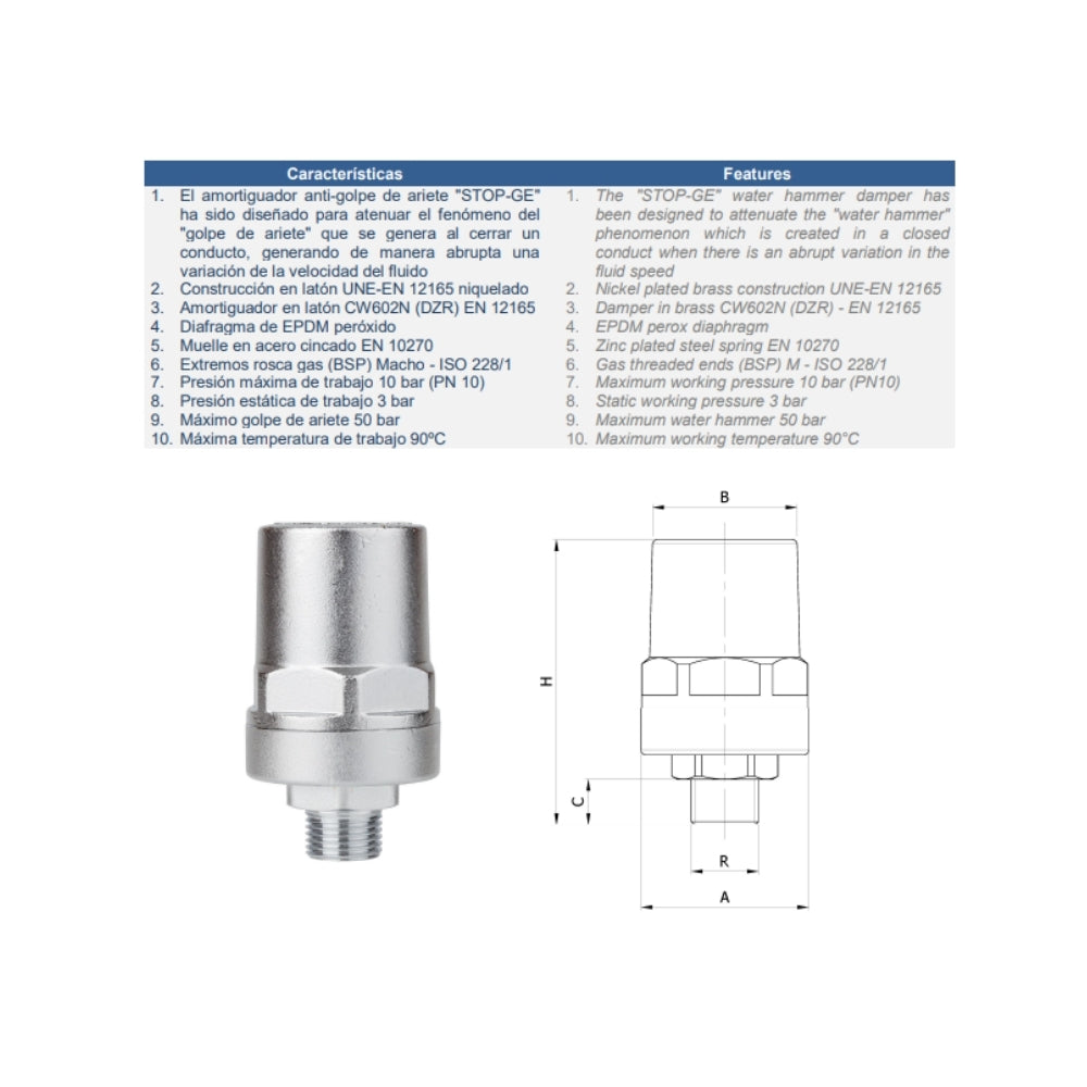 PN 10. Construcción en latón niquelado UNE-EN 12165. Diafragma de EPDM peroxido. Muelle en acero zincado EN 10270. Extremos rosca gas (BSP) M - ISO 228/1. Temperatura màxima de trabajo 90ºC. El amortiguador anti-golpe de ariete "STOP-GE" ha sido diseñado para atenuar el fenómeno del "golpe de ariete" que se genera al cerrar un conducto, generando de manera abrupta una variación de la velocidad del fluido.