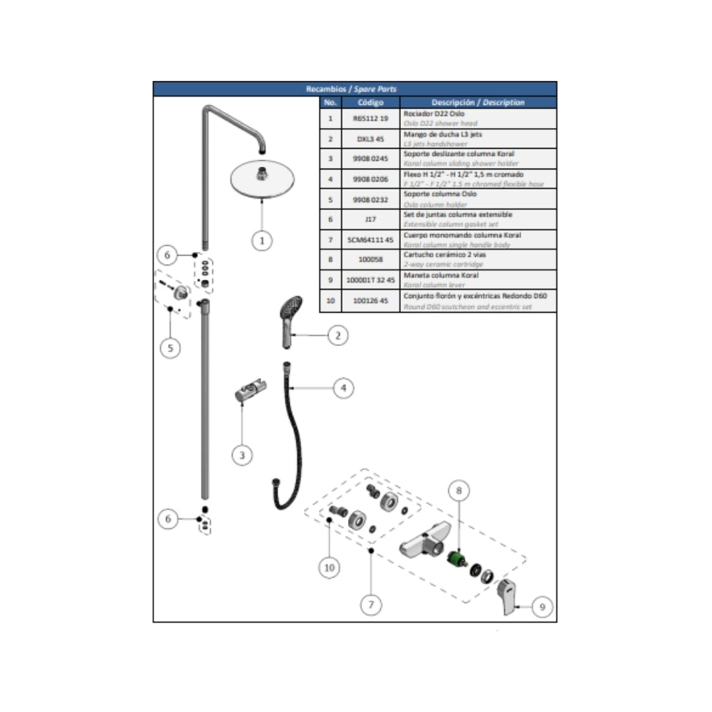7) Suministrada con flexo de ducha de acero inoxidable cromado de 1,5 m, rociador orientable con jet anticalcáreo y mango de ducha con 3 funciones anticalcáreas.