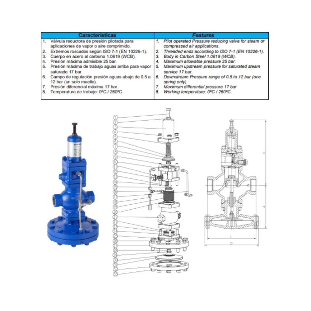 Conexión rosca gas s/ISO 7-1, disponible con rosca NPT (2274N). Construcción: Acero al Carbono 1.0619 (WCB). Presión de entrada máxima 25 bar. Presión de salida desde 0,5 a 12 bar. Temperatura máxima de trabajo 260ºC. (Aplicación en vapor o aire comprimido)