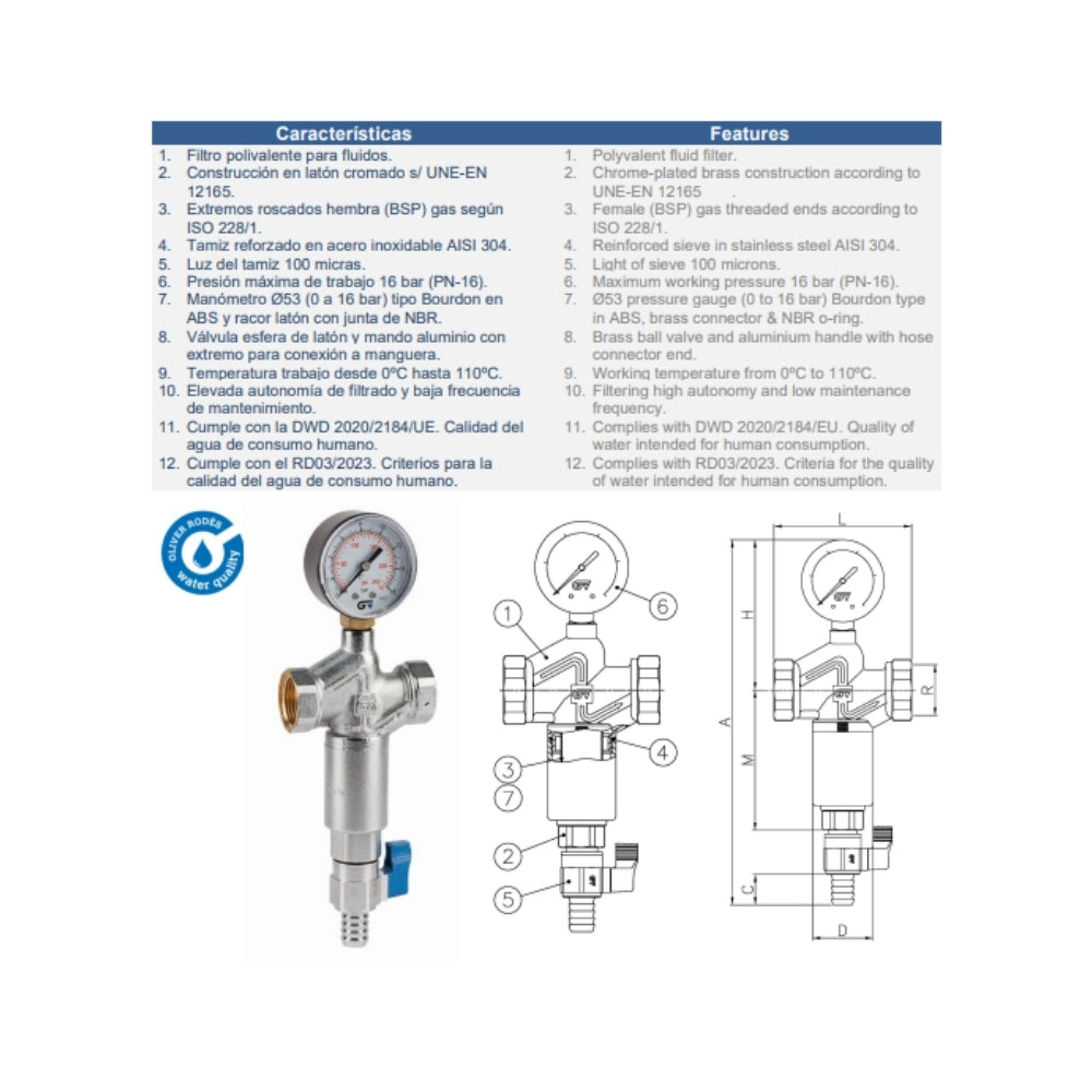PN 16. Construcción en latón UNE-EN 12165 cromado. Tamiz reforzado: acero inox. AISI 304. Luz: 100 micras. Junta NBR. Extremos rosca gas (BSP) H-H - ISO 228/1. Temp. máx. 110ºC.