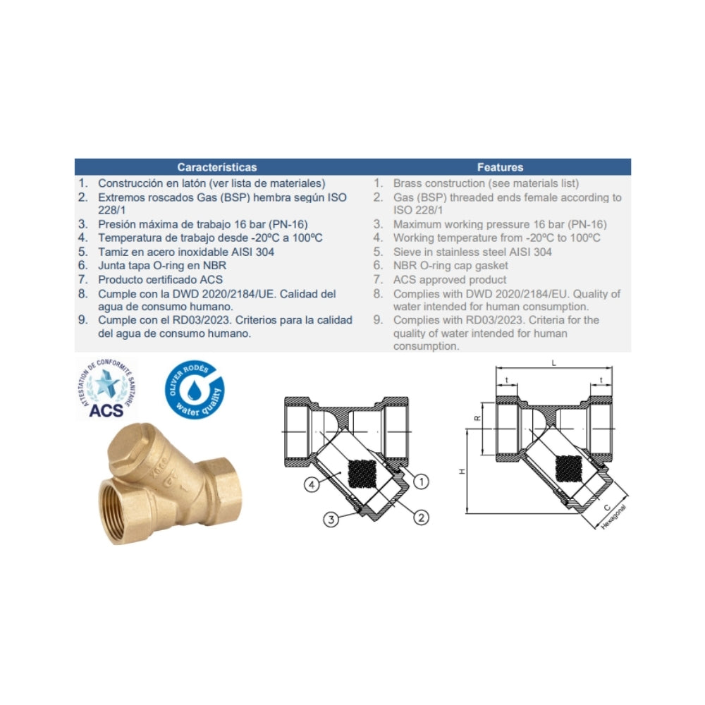 PN 16. Cuerpo latón UNE-EN 12165. Tamiz: inox. AISI 304. Junta tapa: NBR. Temp. máx. 100ºC. Extremos rosca gas (BSP) H– H - ISO 228/1.