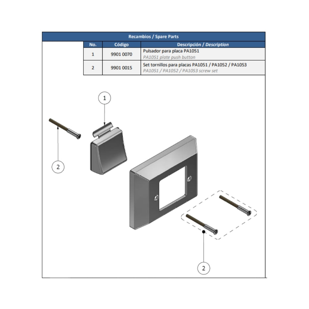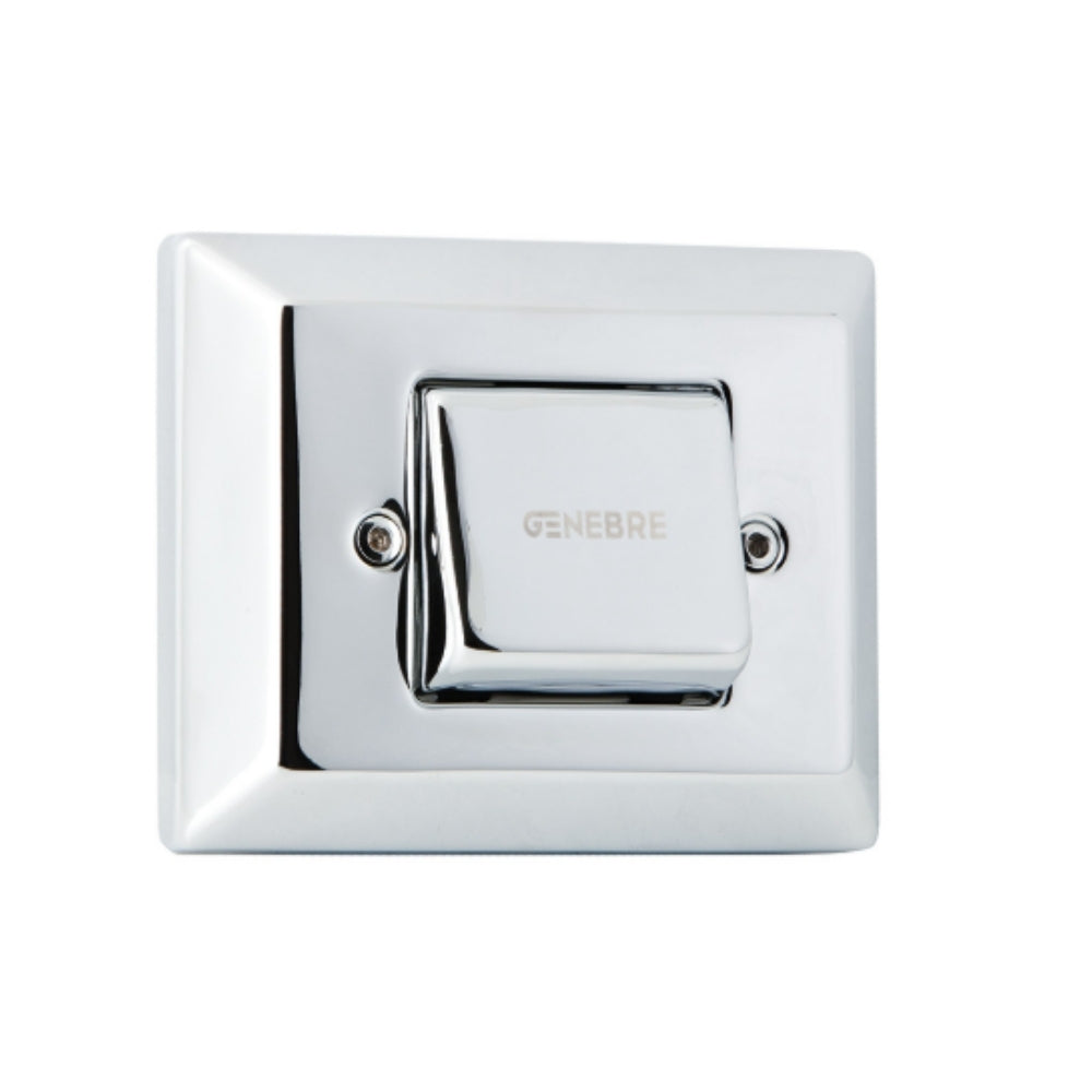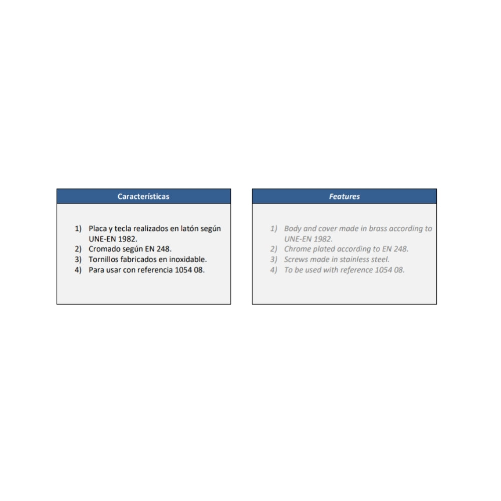Placa con tecla para válvula de descarga empotrada. Fabricada en latón CW617N cromado según EN248. Cuerpo en latón CC754S. Incluye tornillos de acero inoxidable antivandálicos. Para referencia 1054 08.