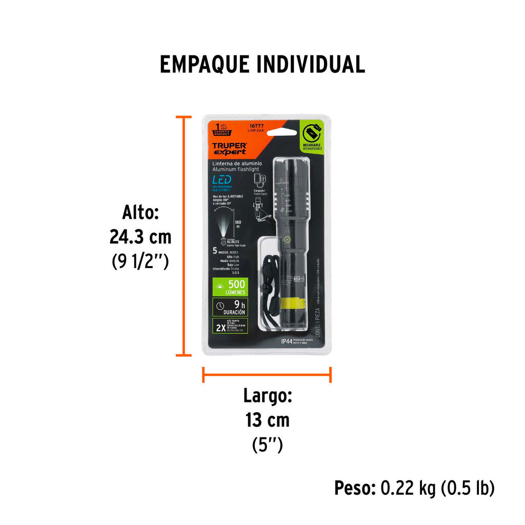 - Modos de iluminación: (5) Alto, medio, bajo, intermitente y SOS