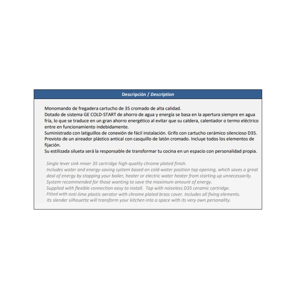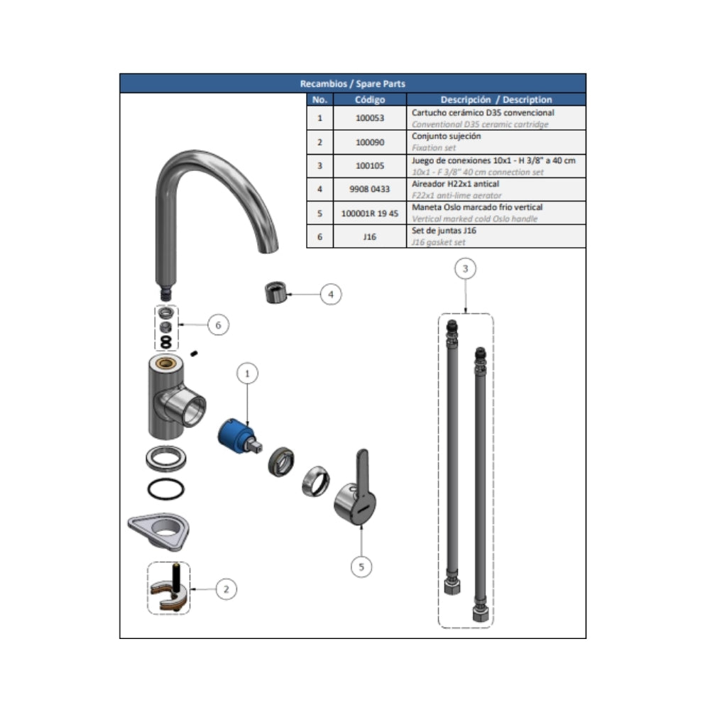6) Suministrado con latiguillos de 40 cm M10x1 H ⅜” y conjunto de sujeción mediante herradura de inoxidable.