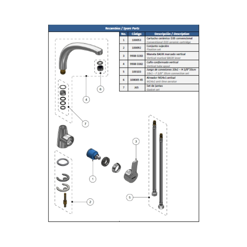 4) Cartucho cerámico silencioso D35 con salida dirigida. 1) Aireador plástico antical M24x1 con casquillo de latón cromado.