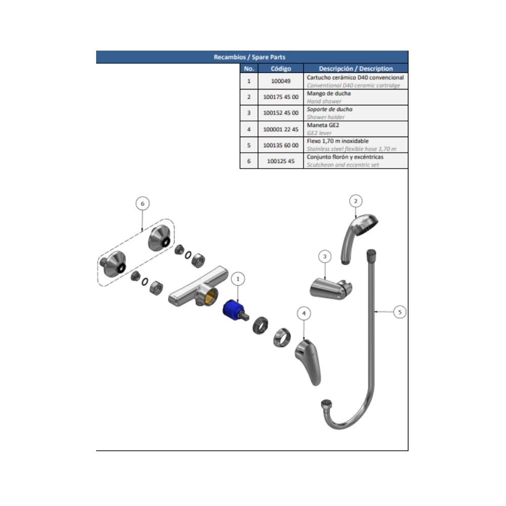 5) Suministrado con flexo ducha de Inoxidable (170 cm), mango de ducha, soporte y excéntricas de latón para fijación.