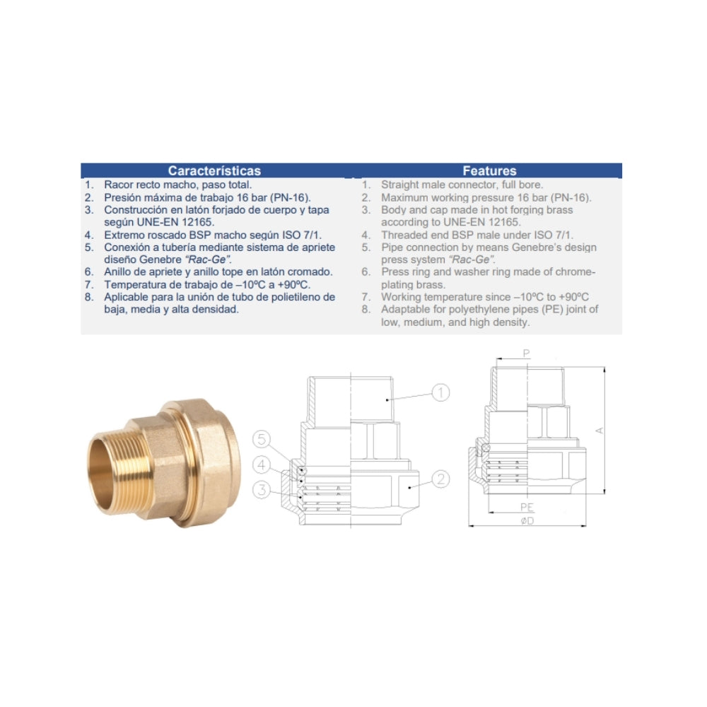 PN-16 - paso total. Construcción en latón forjado s/UNE-EN 12165. Extremo roscado gas macho s/ISO 7/1. Conexión a tubería mediante sistema de apriete diseño Genebre “RAC-GE”. Temperatura de trabajo de -10ºC a 90ºC. Aplicable para la unión de tubo de polietileno de baja, media y alta densidad.