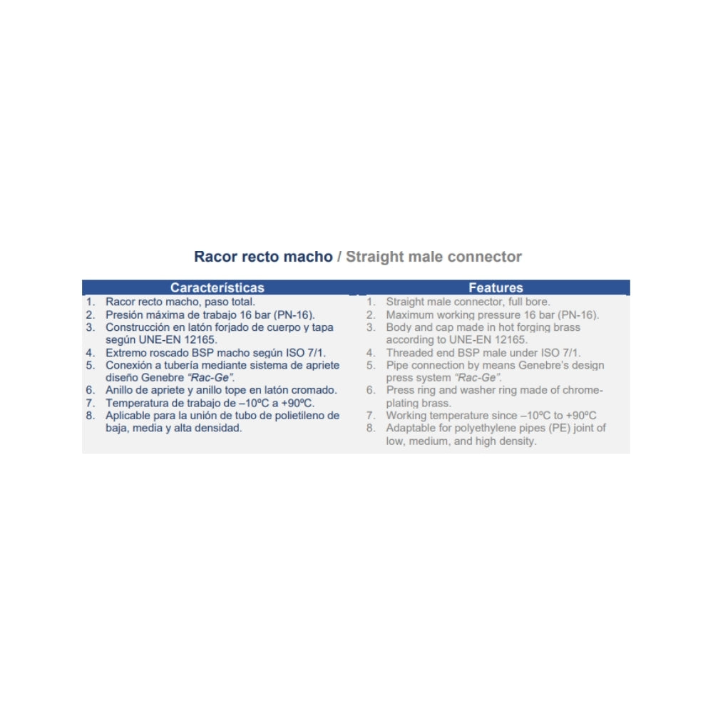 PN-16 - paso total. Construcción en latón forjado s/UNE-EN 12165. Extremo roscado gas macho s/ISO 7/1. Conexión a tubería mediante sistema de apriete diseño Genebre “RAC-GE”. Temperatura de trabajo de -10ºC a 90ºC. Aplicable para la unión de tubo de polietileno de baja, media y alta densidad.