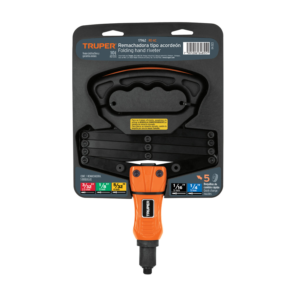 4 boquillas intercambiables para remaches de 3/32", 1/8", 5/32", 3/16" y 1/4"