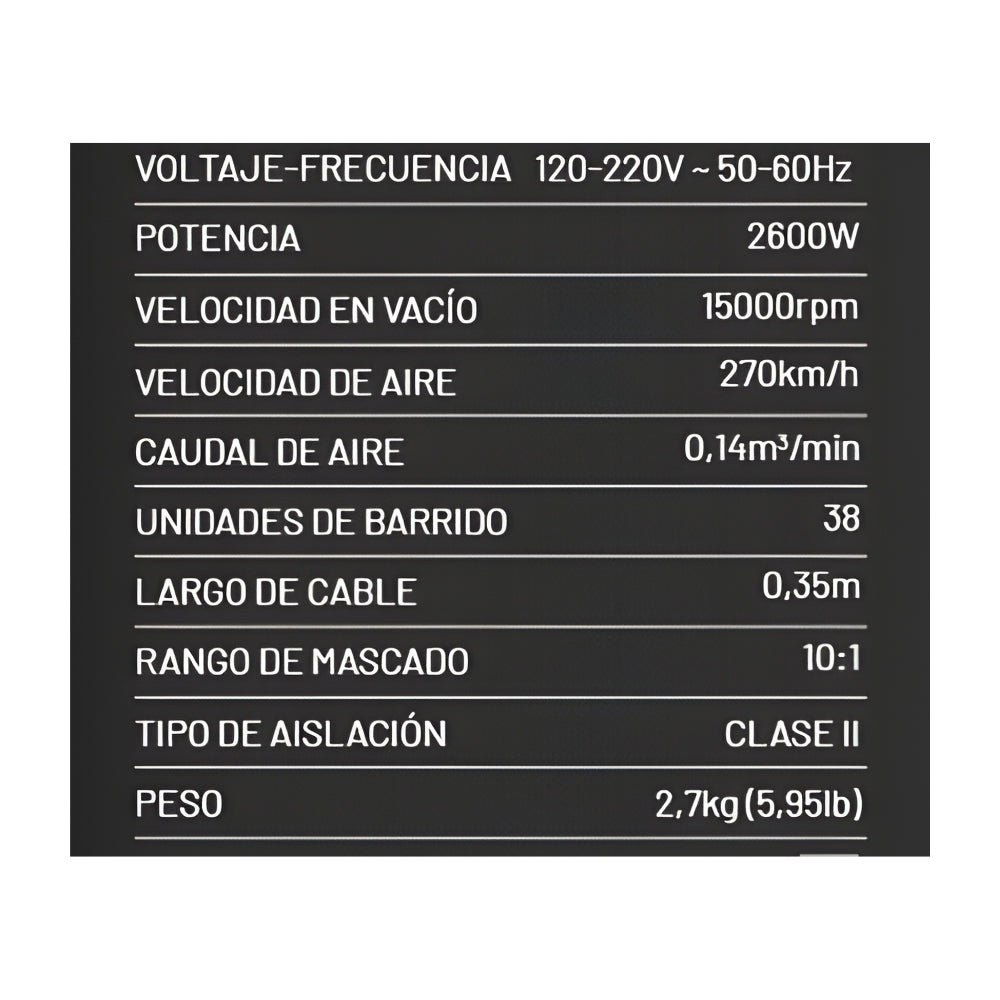Mantén tus exteriores impecables con la potencia extrema de nuestro Soploaspirador de 2600W. Diseñado para ofrecer un rendimiento superior en la recolección de hojas, residuos de césped y pequeños desechos, esta herramienta combina tres funciones esenciales en un solo equipo ergonómico y fácil de usar.