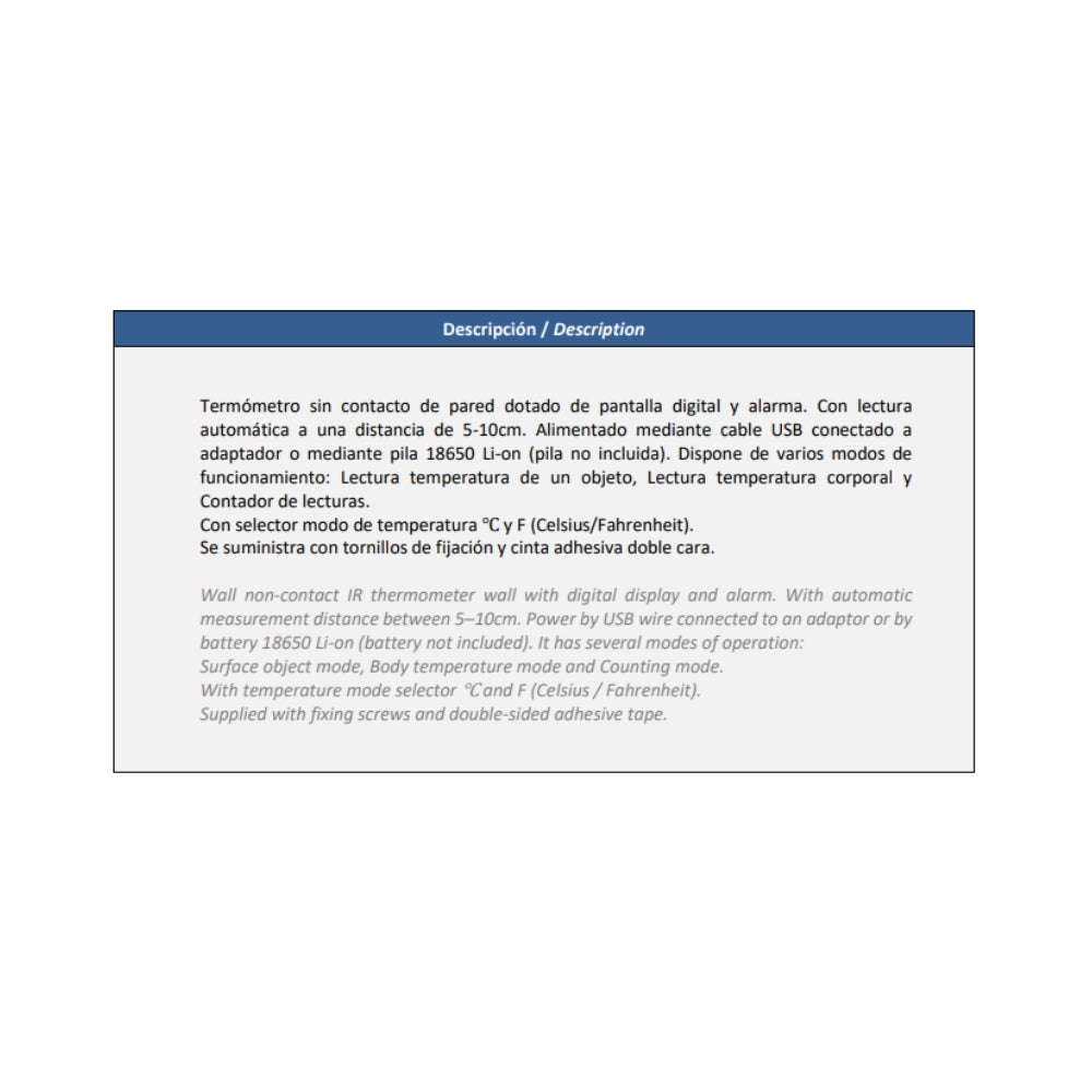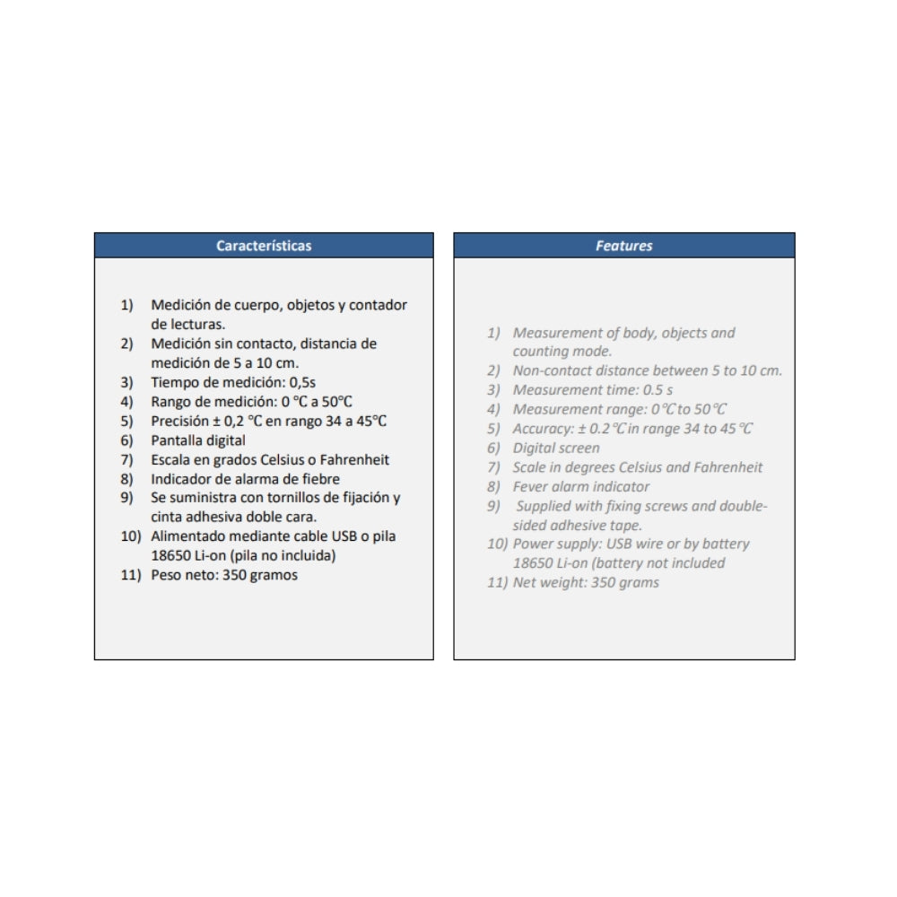 Cantidad de lecturas en modo “contar”: 999. Alarma automática en situación anormal: leds parpadean + señales acústicas. Lectura automática: distancia de medida 5 ~ 10 cm. Pantalla digital. Alimentación: mediante cable USB conectado a adaptador o mediante pila 18650 Li-ion