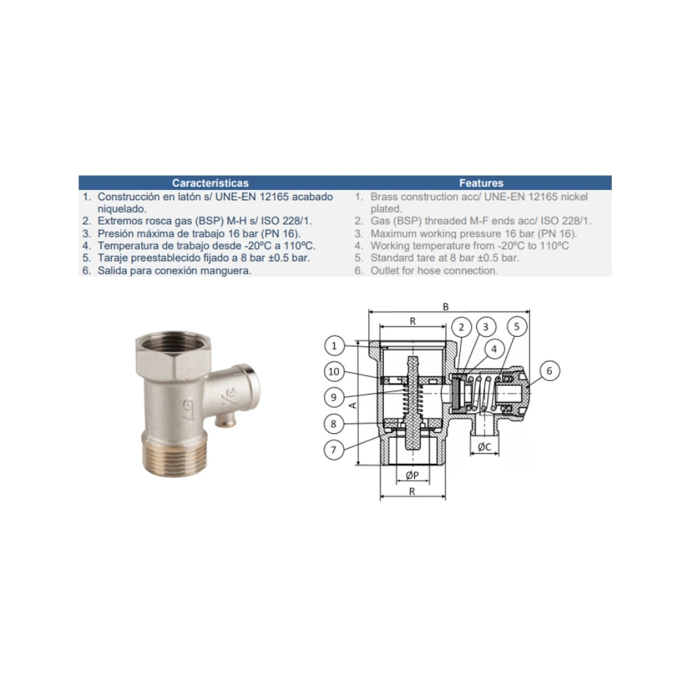 PN 16. Construcción en latón UNE-EN 12165 cromado. Extremos rosca M-H, ISO 228/1. Muelles acero inox. Taraje estándar fijo a 8 bar. Cierre NBR. Temperatura máxima 110°C.