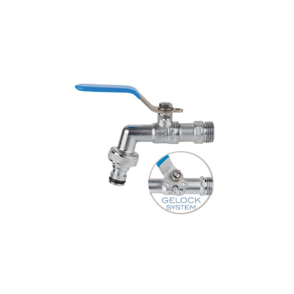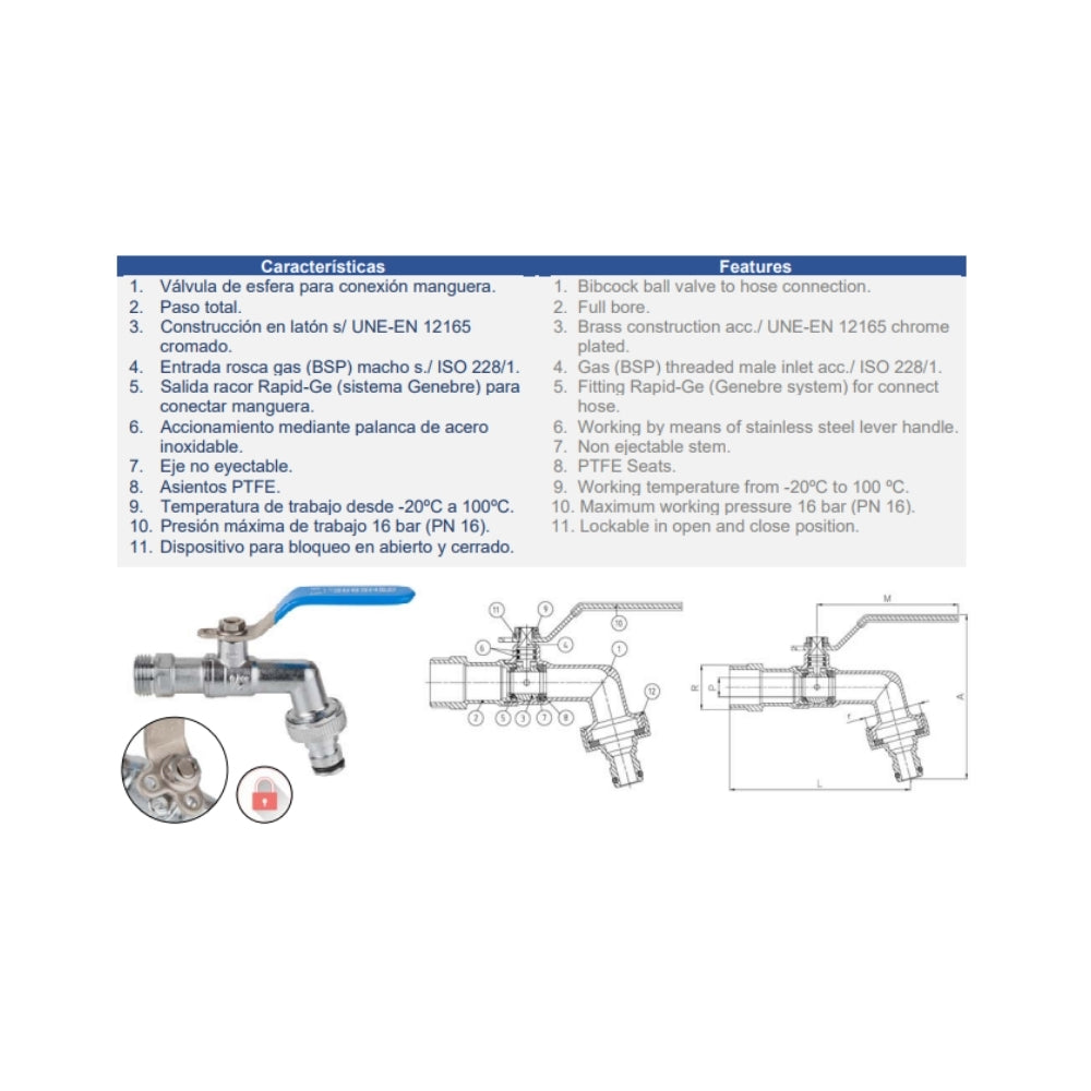 PN 16. Paso total. Construcción en latón UNE-EN 12165 cromado. Asientos PTFE. Entrada rosca gas (BSP) M - ISO 228/1. Salida racor Rapid-Ge conexión manguera. Temp. máx. 100ºC. Mando manual por palanca de acero inoxidable. Precintable en posición de apertura y cierre.