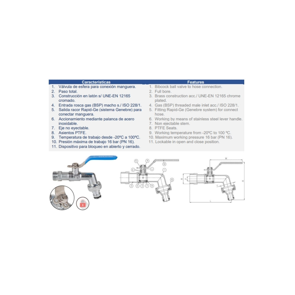 PN 16. Paso total. Construcción en latón UNE-EN 12165 cromado. Asientos PTFE. Entrada rosca gas (BSP) M - ISO 228/1. Salida racor Rapid-Ge conexión manguera. Temp. máx. 100ºC. Mando manual por palanca de acero inoxidable. Precintable en posición de apertura y cierre.