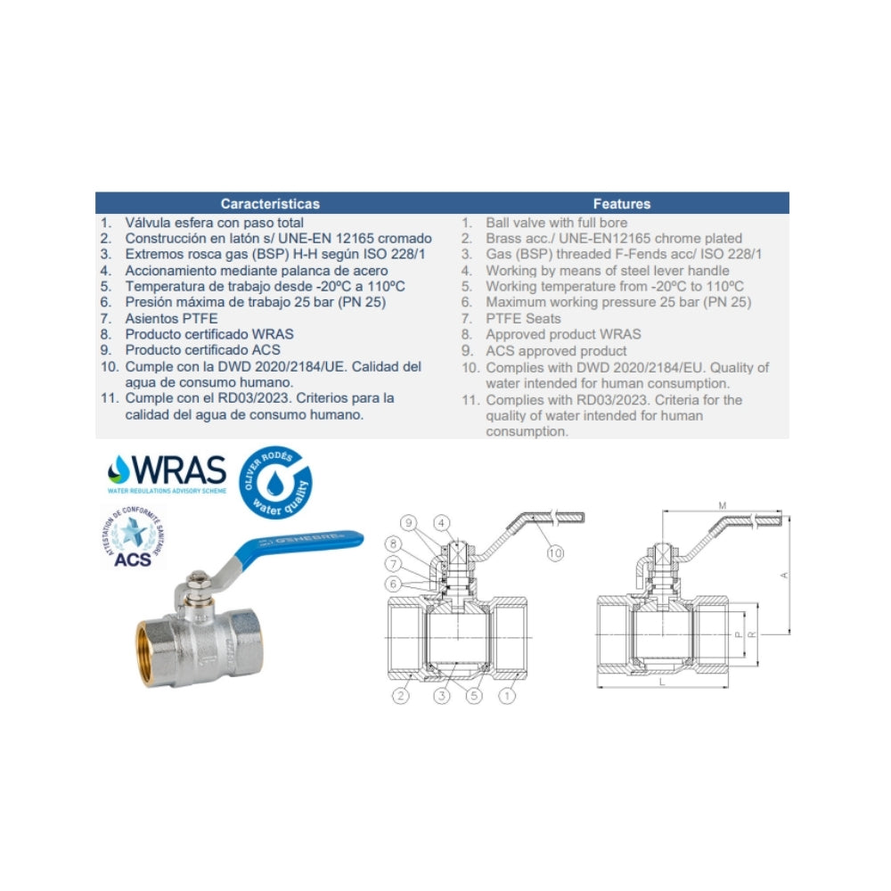 PN 25. Paso total. Construcción en latón UNE-EN 12165 cromado. Asiento PTFE. Extremos roscados H-H - ISO 228/1. Temp. máx. 110ºC. Mando manual por palanca de acero.
