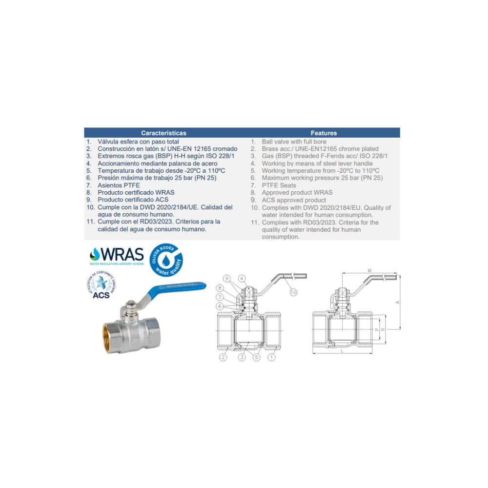 PN 25. Paso total. Construcción en latón UNE-EN 12165 cromado. Asiento PTFE. Extremos roscados H-H - ISO 228/1. Temp. máx. 110ºC. Mando manual por palanca de acero.