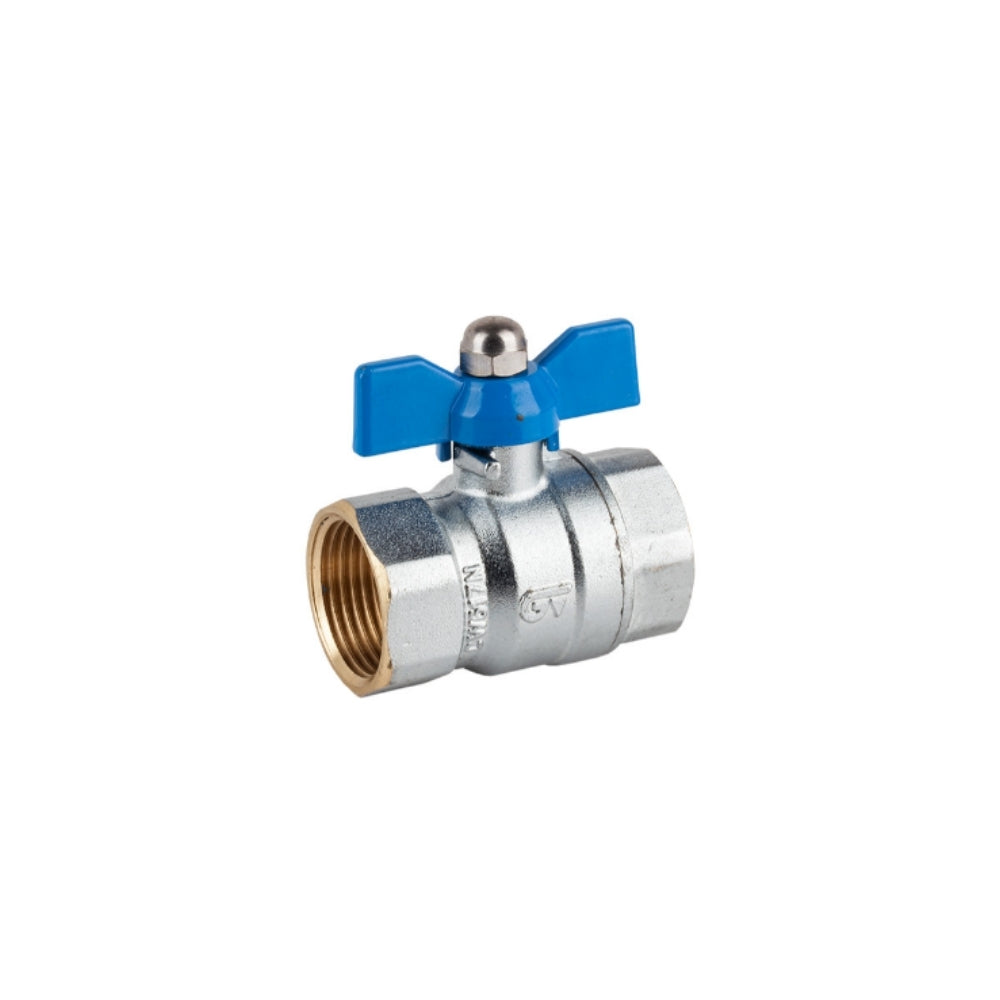 PN 25. Paso total. Construcción en latón UNE-EN 12165 cromado. Asiento PTFE. Extremos rosca gas (BSP) H-H. ISO 228/1. Temp. máx. 110ºC. Mando manual por palomilla aluminio.