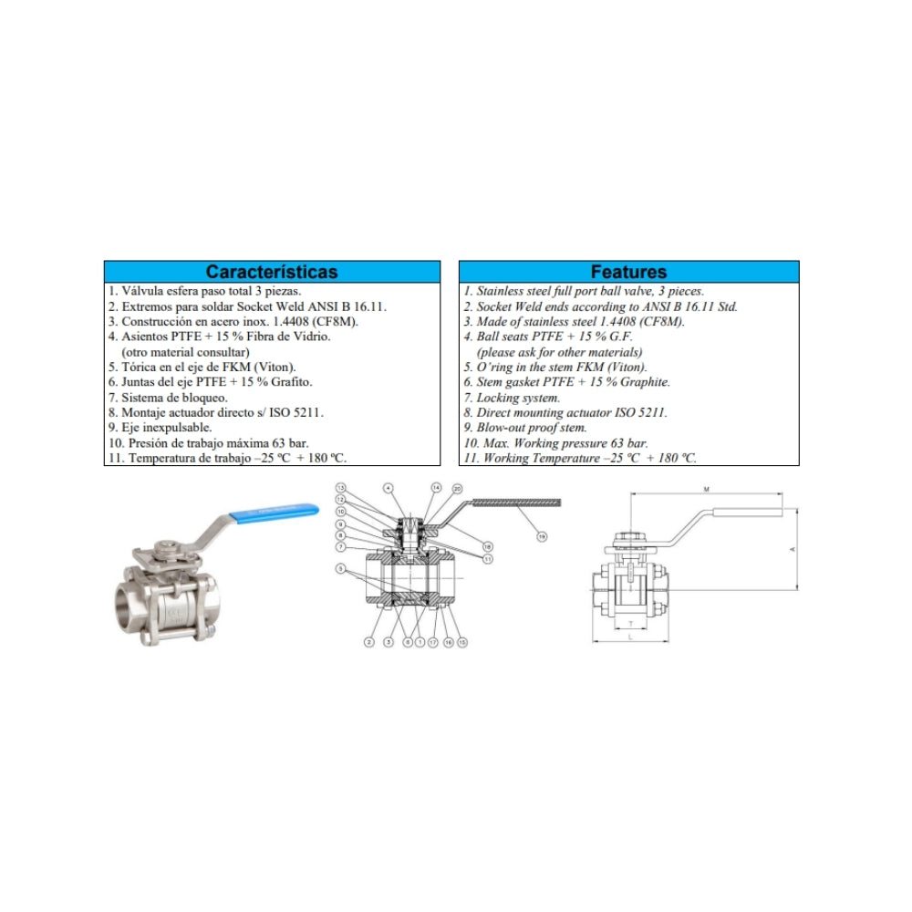 Const.: acero inox. CF8M (316) microfusión. Juntas y asientos PTFE+15% FV tórica eje: vitón. PN 63. Temp. -25ºC +180ºC mando manual por palanca. Montaje directo s/DIN 5211 con sistema de bloqueo.