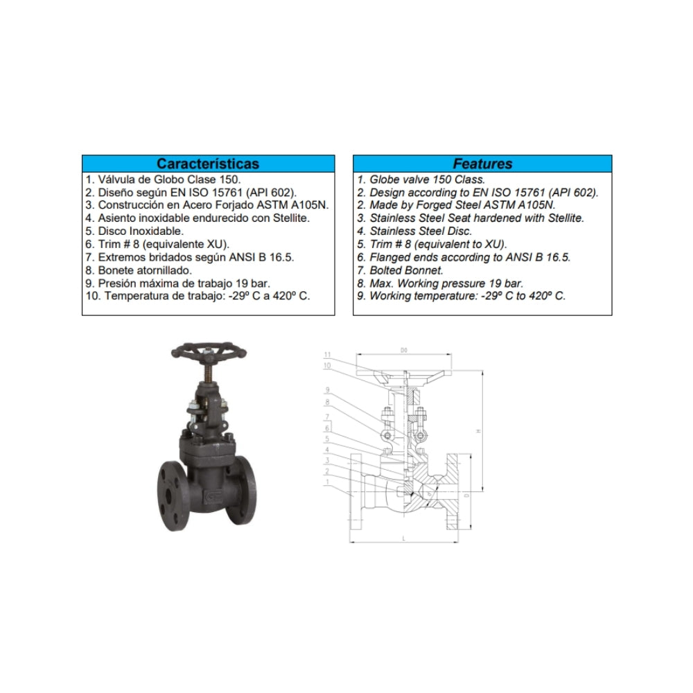 Const. cuerpo y bonete acero forjado ASTM A105N. Material de cierre: asiento con stellite. Compuerta: ASTM A182 - F6a. (Trim #8/XU). Bonete atornillado.