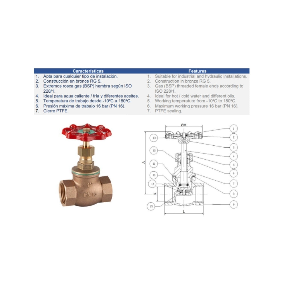 PN 16. Cierre en PTFE. Construcción en Bronce UNE-EN 1982 - Latón UNE-EN 12165. Extremos rosca H-H - ISO 7/1 (EN 10226-1). Temp. máx. 180ºC. Volante de aluminio.
