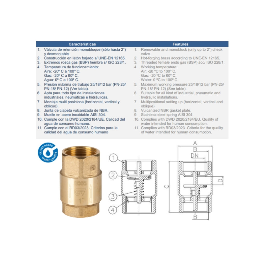 PN 25/12. Construcción en latón UNE-EN 12165. Junta de clapeta vulcanizada de NBR. Muelle en acero inox. AISI 304. Extremos rosca gas (BSP) H-H - ISO 228/1. Temp. máx. 90ºC. Montaje en cualquier posición.