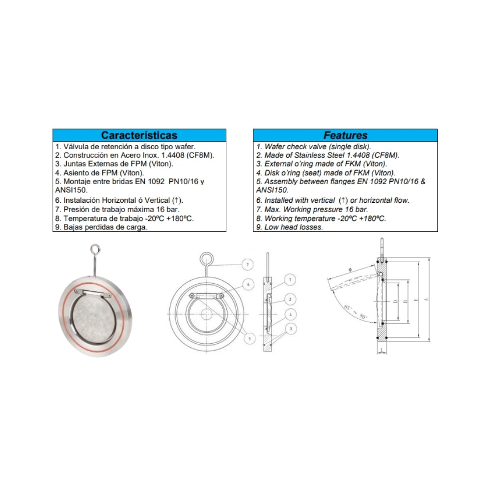 Cuerpo y disco acero INOX 316. Junta tórica: vitón montaje entre bridas PN 10/16 - ANSI 150 lbs.