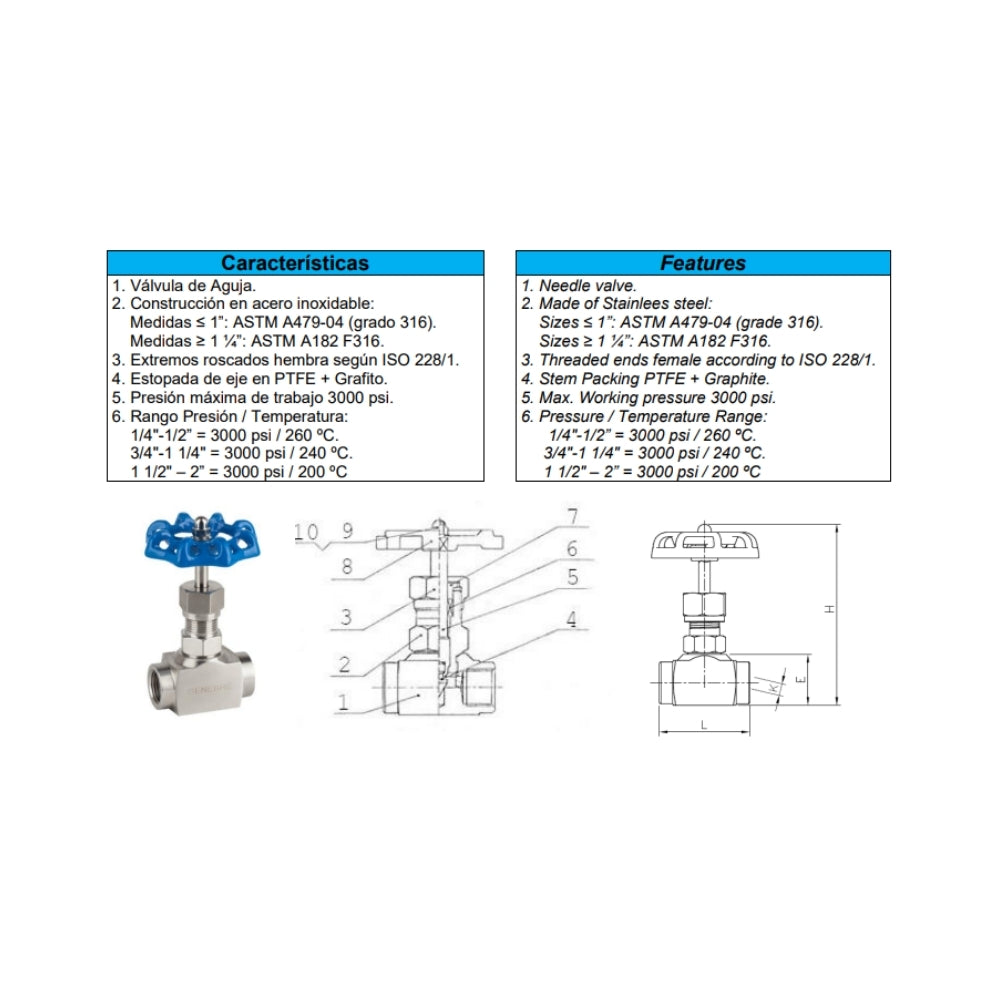 Construcción: acero inoxidable A182 F316/aguja inox A182 F316 + T. térmico. Rosca gas ISO 228-1 H-H. Estopada: PTFE. Presión máxima de trabajo 210 bar. Temperatura de trabajo: -20ºC a 250ºC.