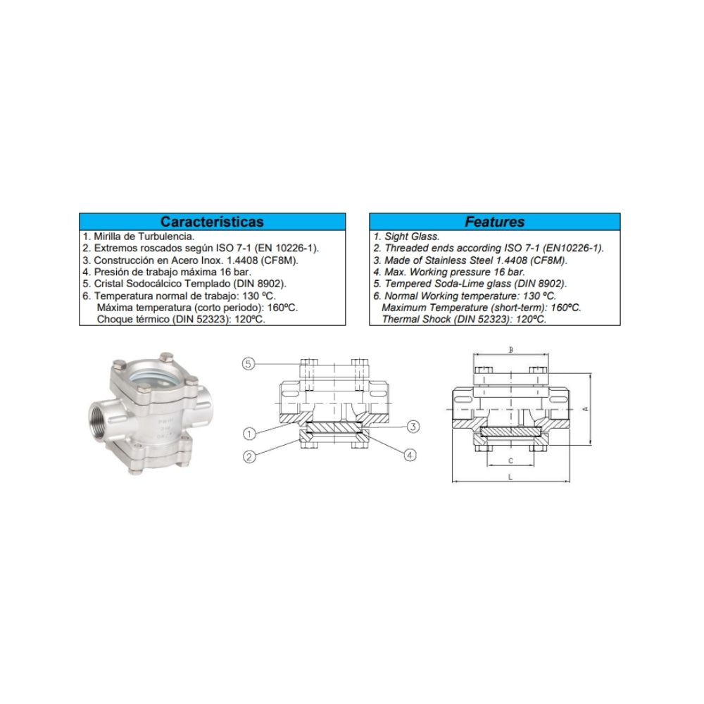 Construcción: cuerpo inox. AISI 316. Extremos rosca gas ISO 7-1 (EN 10226-1). Cristal: normal con tratamiento térmico bajo demanda: cristal “pyrex” (2240P). Presión máx. de trabajo: 16 BAR. Temp. máx. de trabajo: 160ºC.
